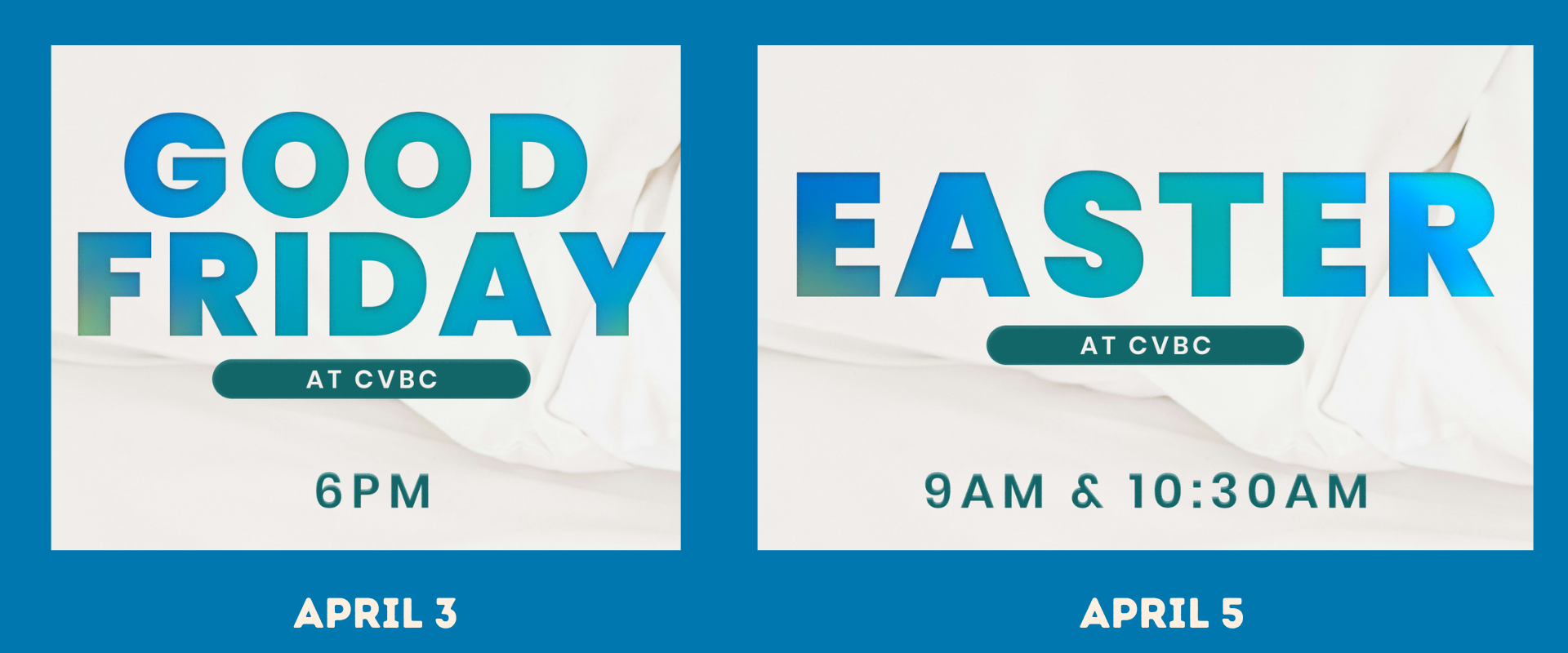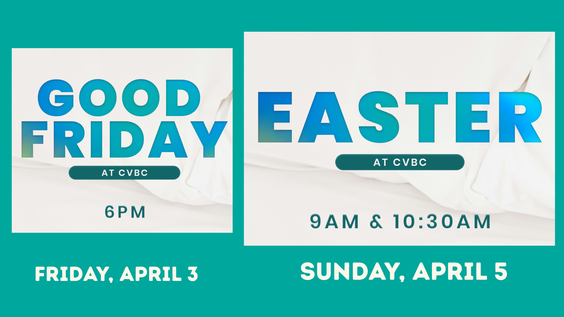Join us for our Good Friday and Easter services. Nursery (for children up to 4 yrs. old) will be provided at all three services.